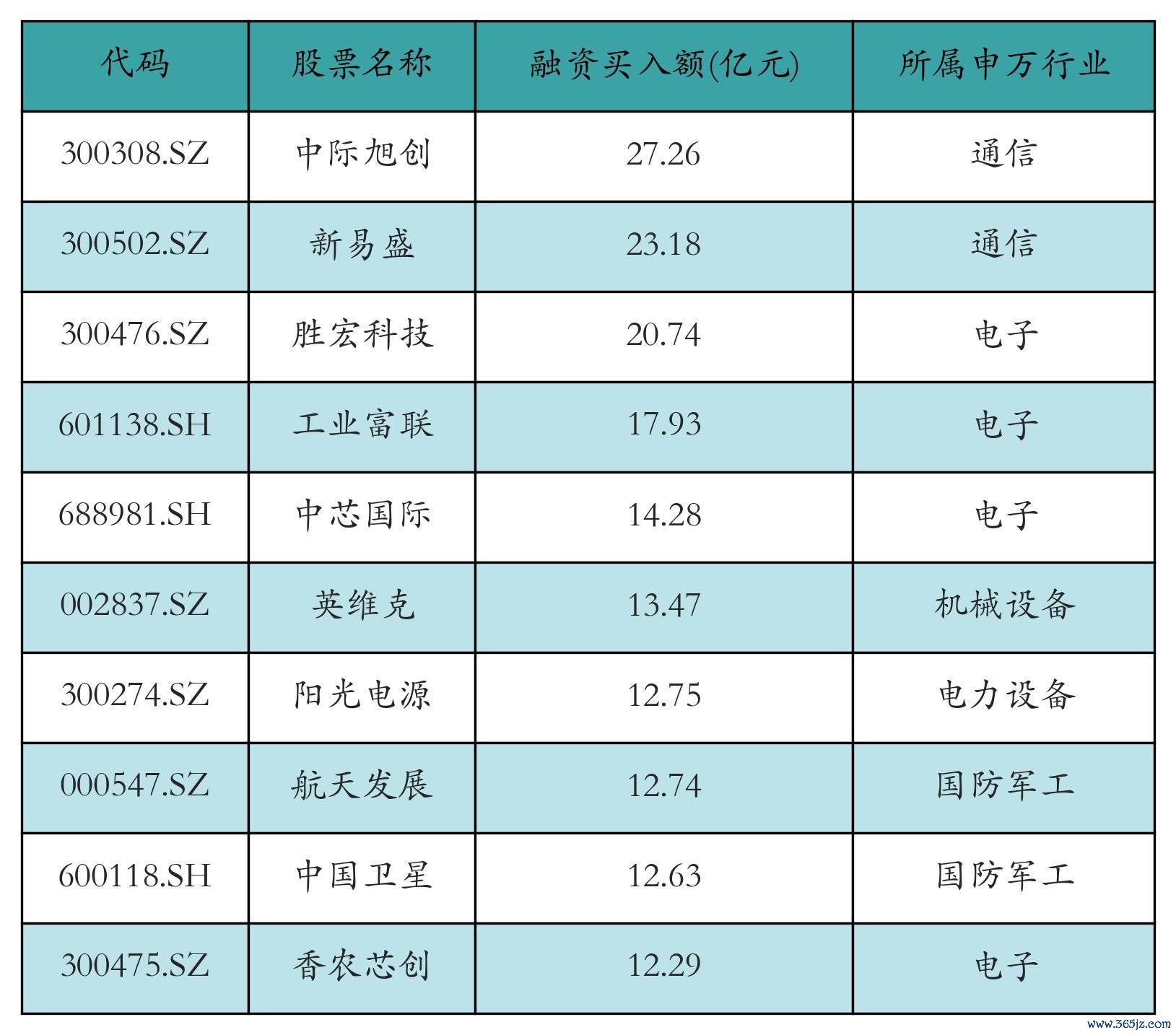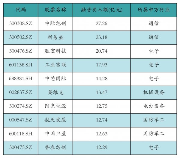 两市共有3471只个股有融资资金买入,其中中际旭创、新易盛、胜宏科技名次前三,买入金额诀别27.26亿元、23.18亿元、20.74亿元。融资买入额前10个股细目见下表: