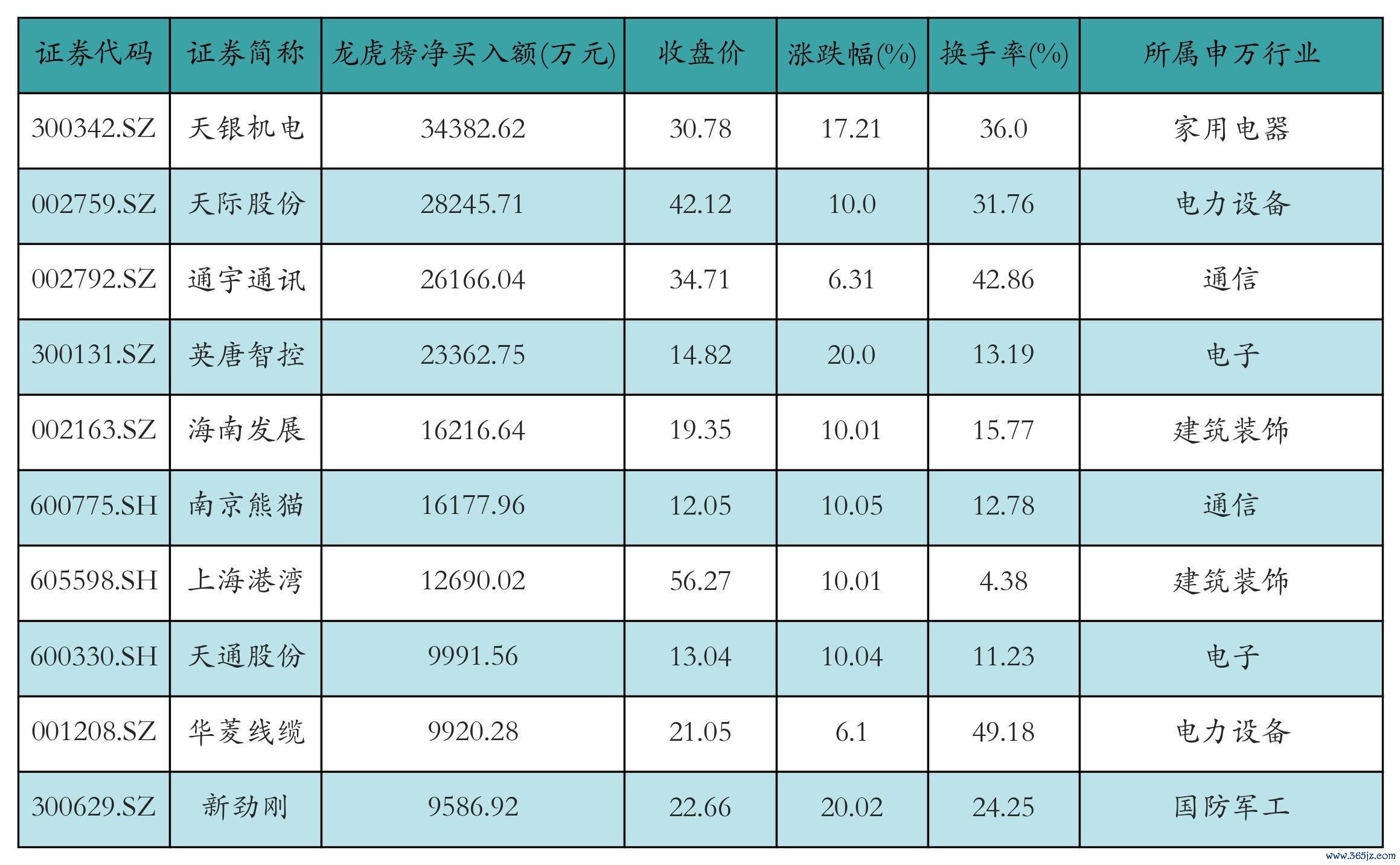 昨日龙虎榜交易部净买入额前10细目见下表: